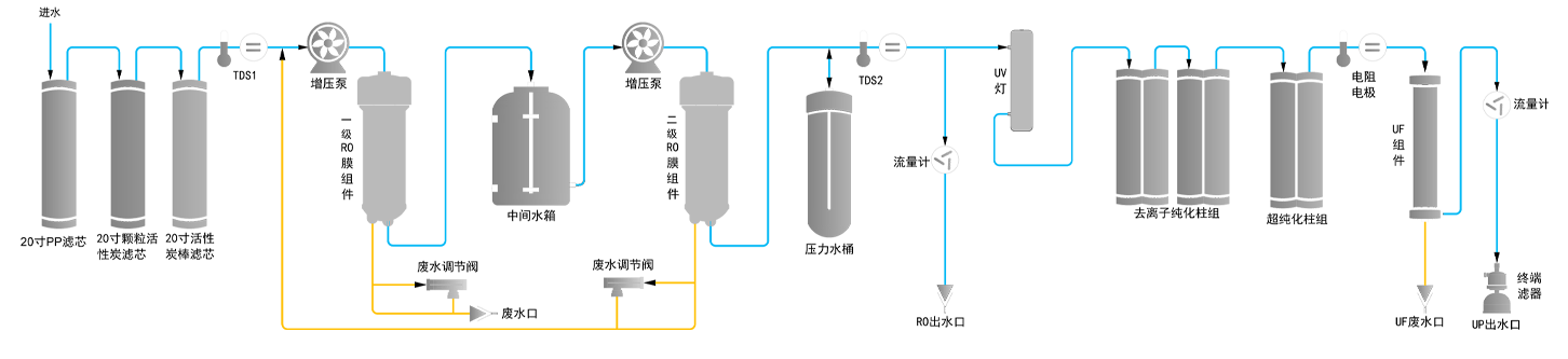 | 一級RO水 | 離子截留率98%-99%(新膜),有機物截留率>99%(MW>200道爾頓)、顆粒和細菌截留率>99% | |||