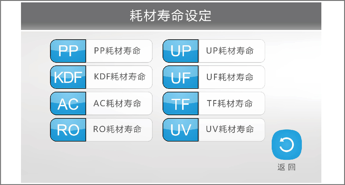 - · PP、KDF、AC、RO、DI、UP、UV、UF、TF耗材壽命可設(shè)定,顯示已使用時間及用量,到期自動提醒更換.